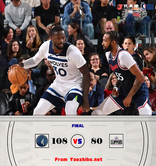 24直播网讯12月5日 NBA常规赛今日继续开打,快船今日坐镇主场迎战森林狼。两支球队在11月底有过一次交手,当时森林狼主场1分险胜。首节之争快船仅仅抵抗了半节的时间就遭遇滑铁卢,他们在本节后5分30秒里崩溃仅得4分,森林狼则抓住机会命中5记三分送出19-4的攻势一举拉开比分;次节森林狼上来再送11-3的攻势将分差拉大扩大至20分以上;快船毫无办法攻防崩盘,兰德尔予取予求半场20分并帮助森林狼取得27分优势进入下半场。休息归来场面依旧,快船这一节手感全无仅得18分,三节下来命中率为31%森林狼完全感受不到抵抗力并在第三节就取得36分领先早早奠定胜局。这之后比赛早早进入练兵时间,虽然他们也打出了17-5的攻势但制造不了任何威胁。最终,森林狼客场再胜快船完成双杀,同时也终结快船主场9连胜。
