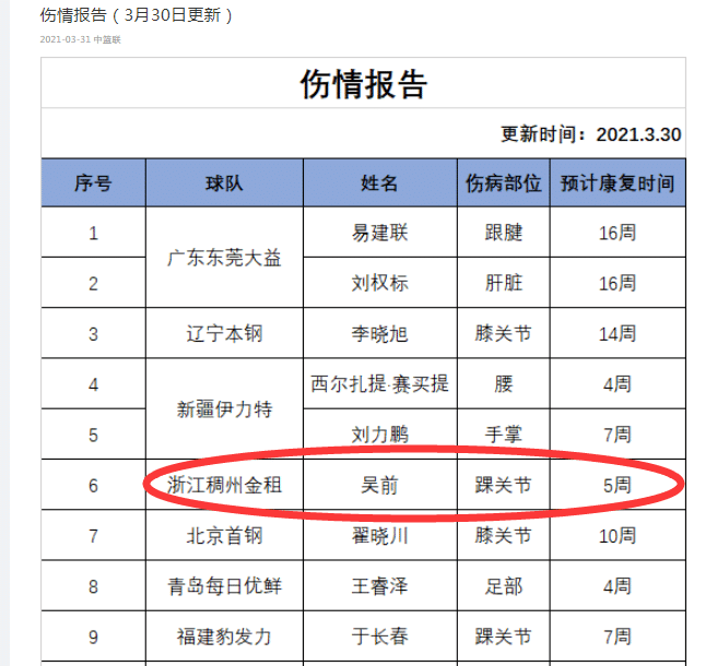 同时这场比赛浙江队大将吴前也遭遇到了伤病打击,他被担架车推出场,送往医院接受检查,今天CBA官方给出的伤情报告显示,吴前要伤缺5周,如果按这个算,他已经提前结束本赛季了,但是随后浙江队更新吴前和陆文博伤情,两人5-7天康复,7天后可参加正常对抗训练。