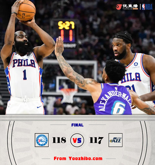 24直播网1月15日讯 爵士今日坐镇主场迎战76人,76人上一场主场不敌雷霆未能延续连胜脚步,球队目前仅列第五但和第二至第四的3支球队差距不大;爵士则凭借近期两场胜利重新登上西部第八的位置,首节争夺76人反客为主上来就接管比赛,以哈登脑后秒传马克西的精彩镜头为缩影,76人轰出22-9的进攻高潮奠定了首节17分的领先;不过第二节76人失去对比赛的掌控,爵士轰出一波18-4的进攻高潮迅速追近比分,76人最后时刻靠着恩比德和马克西的两记三分才重新取得10分领先进入下半场。下半场回归76人依旧被动,爵士节中送出9-0的攻势一度追至1分;末节危难时刻哈登站出来连续命中三分单节拿下18分,奈何76人其他球员表现欠佳,而爵士这边克拉克森也站出来轰下17分一度完成反超,不过恩比德在连续投丢关键球的情况下自我救赎打进关键球奠定胜局。最终,76人客场险胜爵士拿下比赛。
