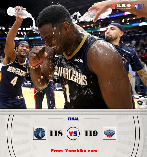 24直播网12月29日讯 NBA常规赛继续进行,森林狼和鹈鹕正面对话,鹈鹕近期迎来三连胜,目前与掘金有1个胜场差距稳居西部第二,森林狼则苦吞三连败,目前以16胜18负的战绩暂列西部第11位。比赛开始后双方你来我往比分紧咬,纳兹-里德里突外投不断取分,鹈鹕则多点开花及时回应,末段森林狼延续火力率先占优,首节结束时森林狼暂时领先4分,次节回来,鹈鹕连中三分一度缩小分差,但中段他们进攻出现停滞,森林狼一波11-2再次拉开比分,半场战罢,森林狼依然领先6分。易边再战后锡安连续杀伤单节爆砍19分,但森林狼稳扎稳打总能及时回应,末段两队延续火力火热对攻,三节结束后森林狼依然领先2分,末节上来,锡安无人可挡连得12分,双方一直缠斗到最后时刻,决胜时刻锡安制造戈贝尔六犯离场后两罚一中,爱德华兹绝杀不中,最终鹈鹕险胜对手。