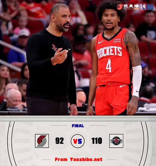 24直播网3月26日讯 NBA常规赛火箭主场迎战开拓者,最近火箭势头凶猛豪取一波8连胜只落后第十的勇士1个胜场,开拓者最近遭遇6连败依旧是在西部倒数第二,本场比赛西蒙斯和艾顿缺阵。开场后开拓者先声夺人取得领先,火箭主将手感不佳,但兰代尔表现出色,他内外开花频频砍分帮助火箭追上并将比分反超。第二节火箭进攻表现更加糟糕,开拓者趁机夺回领先。易边再战,虽然范弗里特依旧失误不断,但杰伦-格林找到状态带领火箭掀起攻势再次将比分反超。最后一节火箭牢牢占据场上优势,最终火箭110-92击败开拓者豪取9连胜只落后勇士0.5个胜场,开拓者遭遇7连败。