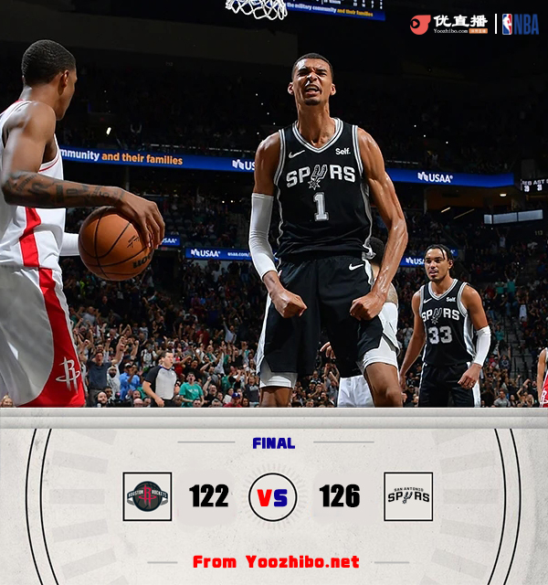 24直播网10月28日讯 NBA常规赛继续进行,马刺主场迎战火箭,两队揭幕战都迎来开门黑,但马刺新科状元文班亚马的表现还是让人眼前一亮。比赛上来,双方都比较慢热,文班亚马再次展现天赋“隔扣”索汉,杰伦-格林状态不错首节独揽10分帮助球队建立主动权,布兰纳姆成为奇兵帮助马刺首节反超2分,次节文班亚马还是外线始终不开,马刺进攻端也陷入停滞,范弗里特接连中投命中帮助球队再次建立领先,马刺接连4记三分追分,特雷-琼斯骑马射箭助马刺半场追平比分。下半场,双方展开激烈拉锯战,比分交替领先,火箭多点开花打出8-2小高潮一度领先到双位数,但末节瓦塞尔接连杀内线造杀伤,文班亚马也在防守端连续送出残暴大帽,马刺还是能咬住比分,比赛进入白热化,小史密斯两罚不中,文班亚马强打抛投追平比分,双方进入加时。加时赛,火箭进攻端出现问题,文班亚马攻防两端做出贡献,马刺顺势6-0建立主动权,范乔丹关键三分续命,但文班接连造杀伤罚球稳住局势,最终马刺加时战胜火箭。