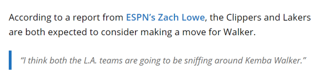 雷霆是一支目标重建的球队,并不适合31岁的沃克。洛维指出,控卫位置需要补强的湖人和快船,都对沃克产生了兴趣。生涯至今,沃克4次入选全明星,并在2018-19赛季入选最佳阵容三阵。