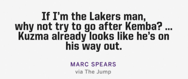 此前,名记斯皮尔斯就曾建议湖人去交易沃克,他在The Jump节目上说道:“如果我是湖人,为什么不去追逐沃克呢?库兹马看上去已经要离开了。”湖人能够用于交易的筹码并不多,库兹马是其中一个。美媒建议湖人送出库兹马、哈雷尔和2025年的首轮签,去换来沃克。