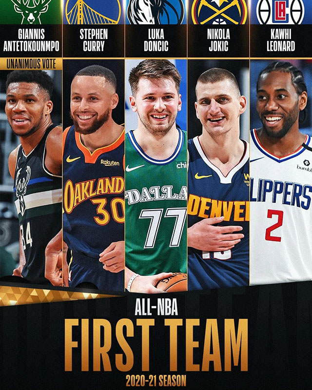 24直播网讯 北京时间6月16日,NBA官方公布了2020-21赛季的最佳阵容名单。在最佳阵容的评选中,字母哥得到100张第一选票,全票入选一阵,算上今年,字母哥已经连续三年同时入选一阵一防; MVP约老师拿了99张第一选票,498分名列第二,库里则是496分位居第三。