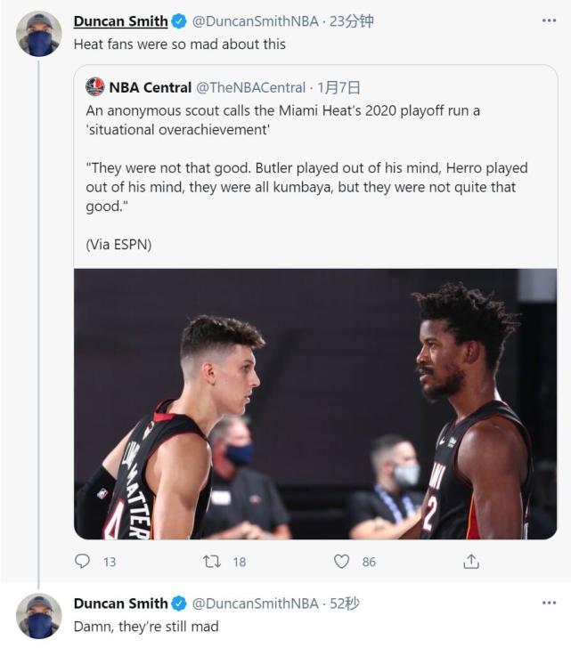 上赛季的亚军,如今要在首轮被横扫淘汰,美媒纷纷刷屏吐槽热火,他们上赛季一路打进总决赛的成绩又被遭到质疑。美记Duncan Smith转发了此前热火状态不佳的消息并表示,“巴特勒和希罗的状态仍然堪忧,上赛季的在迪士尼的比赛简直就是为热火设计的”,前绿军管理层发推调侃道:“消息源,热火改变了自己的主场,他们G4将移师迪士尼对阵雄鹿。”