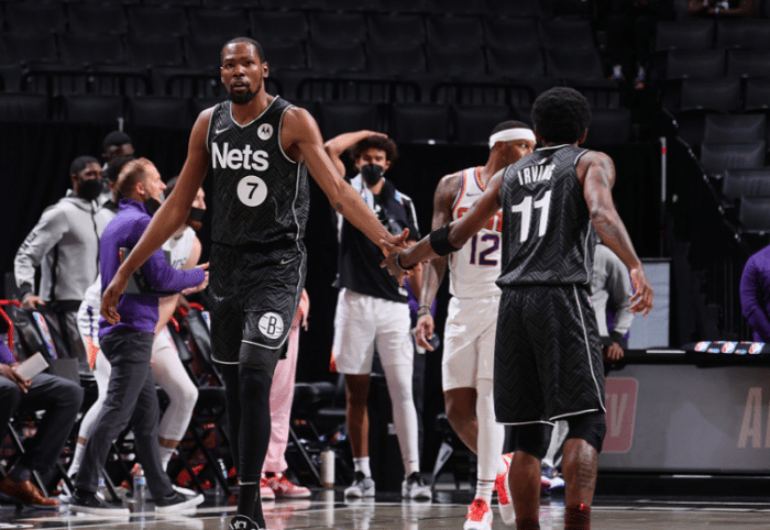24直播网讯北京时间4月26日,NBA常规赛结束了一场比赛,篮网主场128-119战胜太阳,目前稳居东部第一。本场比赛欧文和杜兰特均表现出色,欧文全场比赛轰下34分6篮板12助攻,杜兰特替补出战贡献33分6篮板4助攻。