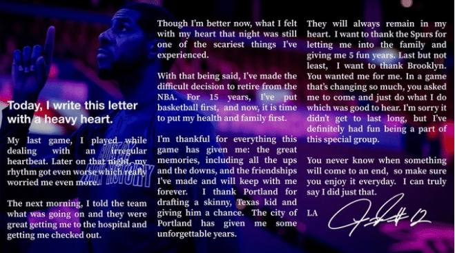 24直播网讯 篮网球星阿德在社交媒体上发布长文,正式宣布退役。这样的决定非常突然,尤其是在本赛季的阿德离开马刺,来到篮网追求生涯首冠。根据阿德的声明中可以看出,在和湖人的比赛结束之后,他心脏的问题变得严重,阿德称这是经历了最恐怖的事情之一,所以虽然目前阿德身体没有大碍,但出于健康和家庭层面的考虑,这位36岁的7届全明星宣布退正式役。