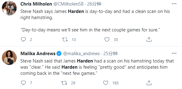 篮网对阵黄蜂赛前,纳什谈到哈登的伤情:目前哈登感觉良好,他已经进行了磁共振扫描,结果很清晰,伤势并无大碍,预计他在接下来的几场比赛中能够复出。