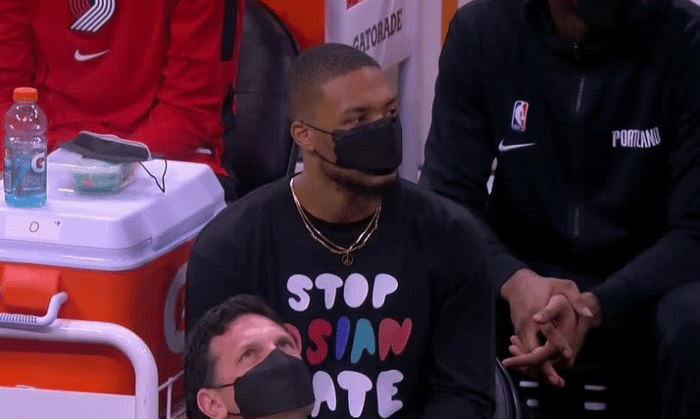 24直播网2月27日讯 今天开拓者以112-105击败魔术,此役利拉德缺席,他在场边观战,镜头给到利拉德的时候,可以看到他穿着的是“停止仇恨亚裔”(STOP ASIAN HATE)标语的上衣,非常抢眼。利拉德通过这样的方式表达了自己的态度。此前詹姆斯、保罗乔治、麦科勒姆和韦德等人也都进行发声。