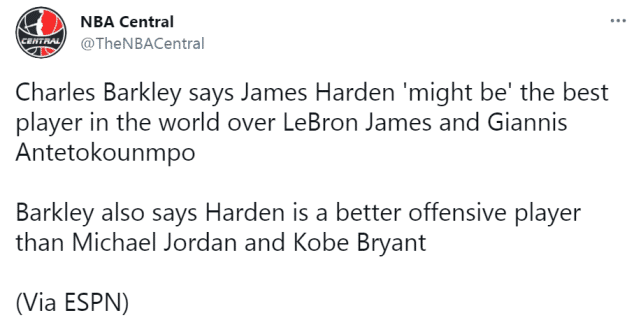 巴克利最欣赏的是哈登的进攻实力,他认为哈登的进攻甚至比乔丹、科比更加出色。“就像我说的,他是我见过最棒的进攻球员,听着,从后卫角度出发,迈克尔(乔丹)和科比是更好的球员,但论及进攻,他们不能像哈登这样投三分和制造犯规。我的意思,这家伙每一次冲到篮下,都能得到两次罚球。”