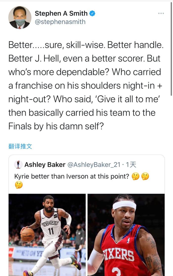 24直播网3月23日讯 ,有人在社交媒体上提出了一个问题:现在的欧文比曾经的艾弗森要强吗?美国名嘴A-史密斯转发推特并说到:在某些方面欧文更强,但答案就是“答案”。