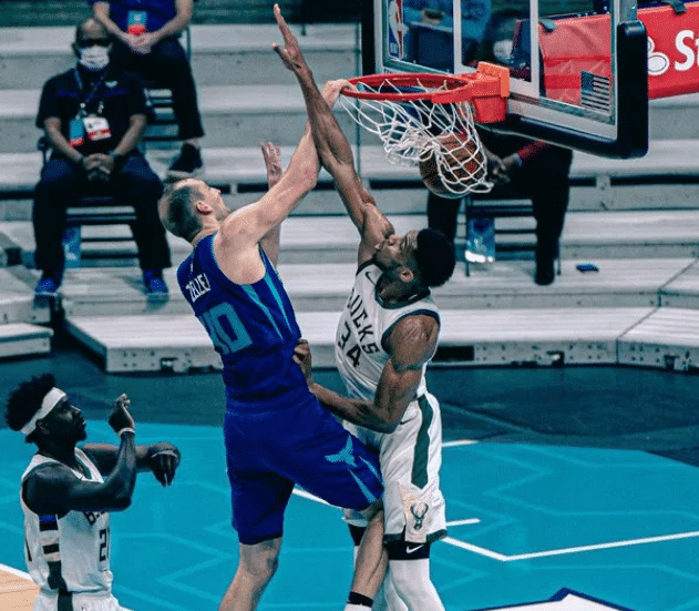 没有对比也就没有伤害。同在场上打4号位的字母哥和格里芬。两人因臂展悬殊,在扣篮后就会产生两种截然不同的画面。同在对阵热火的比赛中,字母哥在内线完成扣篮,双脚着地,扣完篮的单手则紧紧抓住篮筐。虽然篮筐被字母哥拽得向下倾斜不少。但能做到双脚落地,单手抓篮筐的球员,这样的球员在NBA真是寥寥无几!