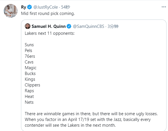 湖人接下来11场比赛的对手分别是太阳、鹈鹕、费城、骑士、魔术、雄鹿、国王、快船、猛龙、热火和篮网,其中有7场要打排名东西部前八的球队,还有篮网、快船和雄鹿这样的冲冠级别的豪强;到了四月份,湖人要打一波7连客,由于湖人仅仅领先西部第六的开拓者2.5个胜场,这下湖人真要麻烦了。