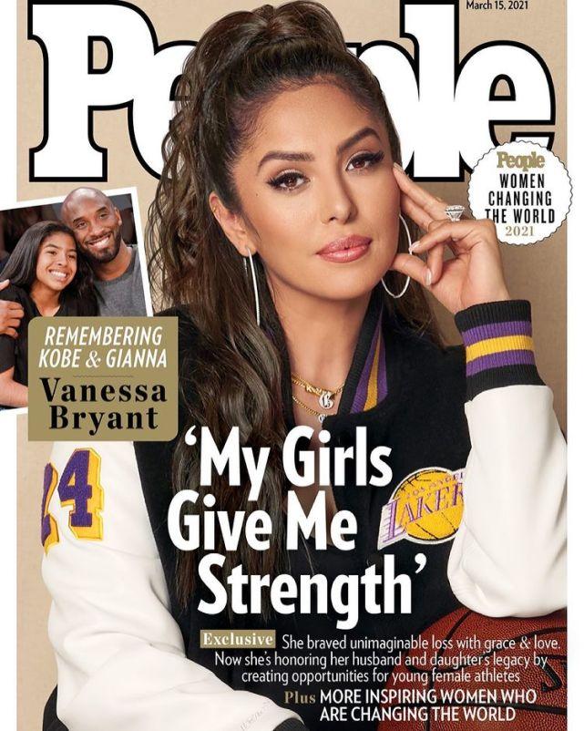 封面上除了瓦妮莎,还有科比搂着二女儿吉安娜的照片。封面配文写道:缅怀科比与吉安娜,瓦妮莎:我的女儿们给了我力量。
