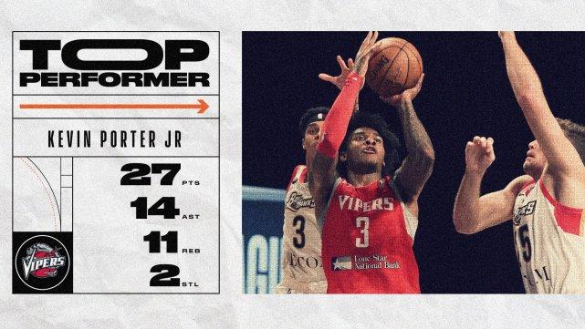 24直播网2月26日讯 北京时间2月26日,G联赛继续进行,火箭下属的毒蛇队124-113击败了目前排名G联赛第一的伊里湾鹰队。凯文-波特发挥出色,全场24中11,得到27分11篮板14助攻的三双数据,此外还有2次抢断和1次盖帽。波特成为了今年G联赛开战至今第一位拿下三双数据的球员。