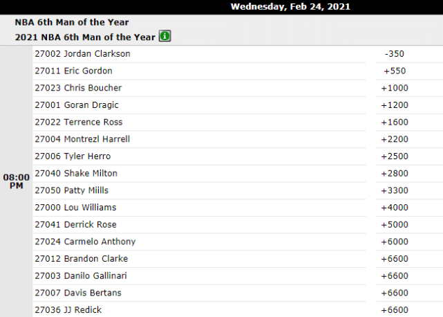 和最佳新秀类似,最佳第六人的悬念也不大了。爵士的克拉克森荣膺这一奖项的赔率是-350,位居第一,排名第二的是火箭的戈登,赔率是+550。两人得分数据差不多,但克拉克森的命中率更高,而且爵士的战绩比火箭好了不是一星半点,所以克拉克森当选难度不大。
