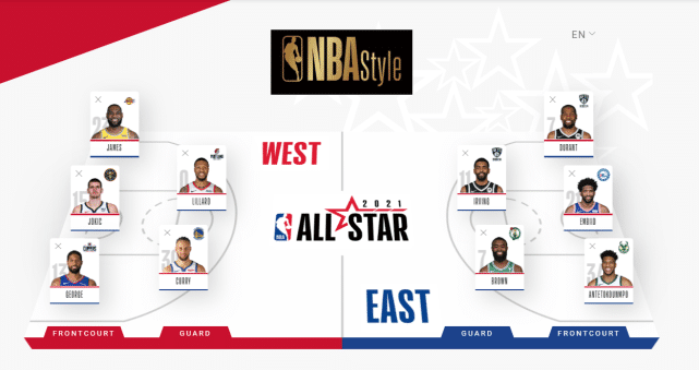 帕金斯选择的东部全明星首发阵容是:欧文、布朗、杜兰特、字母哥和恩比德;西部全明星首发阵容是:库里、利拉德、乔治、詹姆斯和约基奇