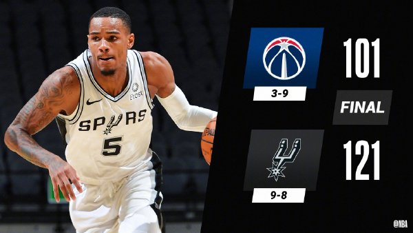 末节,盖伊连投带罚连得4分后,帮助马刺取得10分领先。莱恩连投带罚连得6分威少也打进两球,率领奇才不断追赶,但是马刺火力更盛,穆雷和沃克各自连投中投和三分,随着米尔斯连飚两记三分,马刺将分差扩大到了19分,比赛进入垃圾时间,最终马刺以121-101迎来大胜。