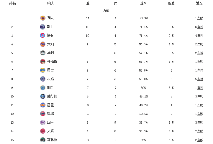 西部1-8名:湖人爵士快船太阳马刺开拓者勇士灰熊