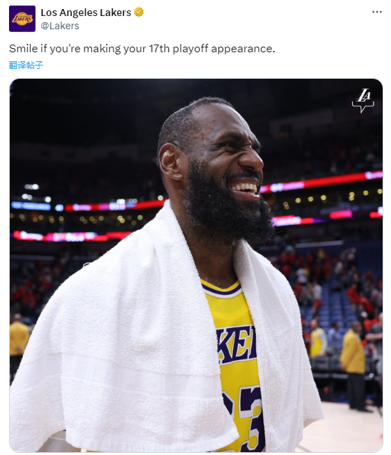 这是湖人队史第64次晋级,这也是詹姆斯生涯第17次晋级季后赛;赛后湖人官方晒出詹姆斯咧嘴大笑的开心照,配文写道:如果你第17次晋级季后赛,那就尽情大笑吧。
