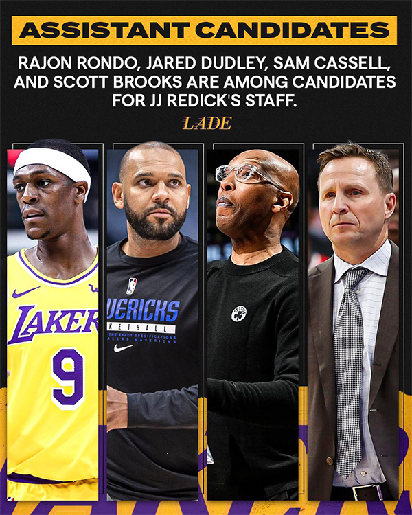 湖人助教候选人前雷霆主帅斯科特-布鲁克斯、前湖人后卫拉简-隆多、前湖人球员贾里德-杜德利和凯尔特人助教卡塞尔。