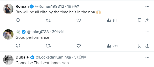 布莱斯已经17岁了,在同龄球员中的表现很不错,展现不俗的传球视野、三分投射以及防守能力;布莱斯在推特上的表现引热议,美球迷盛赞布莱斯能在NBA成为精英级别的球员,还有球迷表示他会成为詹姆斯最好的儿子。