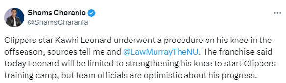 名记shams报道,今夏小卡接受了膝盖手术,对于小卡的伤势,快船总裁劳伦斯-弗兰克表示:他的右膝肿胀已经明显消退,但尚未完全消退。他想参加训练营的所有活动,但我们会阻止他进行部分训练,我们会让他将专注于力量训练,因为我们的目标是让他恢复至100%,这样他不仅可以在这赛季,而且可以在未来很多年里拥有伟大的赛季。