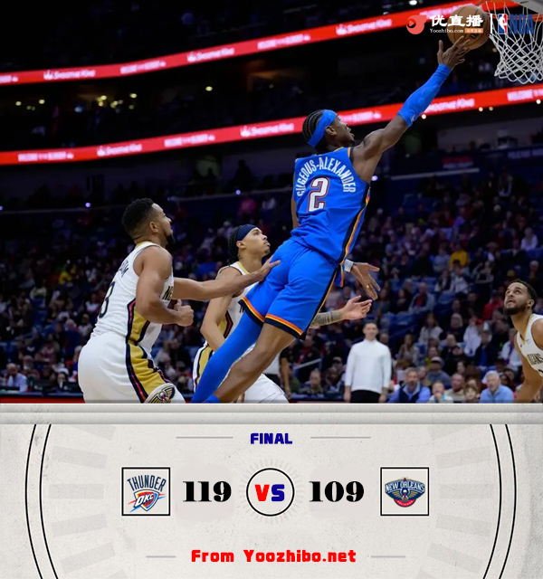 雷霆119-109战胜鹈鹕 亚历山大31分 杰威27+6+5 穆雷26+9+5 莺歌伤退