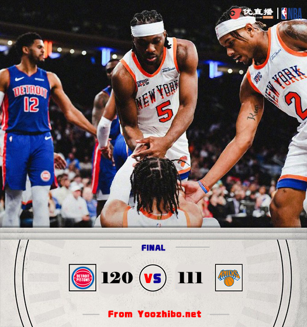 NBA常规赛激战正酣,尼克斯主场迎战活塞,此役唐斯因膝伤缺阵。尼克斯4连胜后战绩更新为14胜8负,稳居东部第4位,活塞则遭遇三连败,9胜15负排在东部第11位。此役一上来尼克斯进攻哑火3分半钟内仅得2分,活塞反客为主连中三分,轰出13-2开局确立优势,布伦森连投带罚短暂止血,难奈活塞多点开花,首节结束时活塞已经领先16分,次节回来,康宁汉姆火力不减单节独得16分,布伦森率队苦苦追分,但末段活塞再度回敬10-0小高潮,半场战罢,活塞保持11分优势。易边再战后双方进攻火力放缓,活塞稳扎稳打总能给予回应,三节结束后活塞依然领先8分,末节上来,尼克斯一度将分差追至只剩2分,活塞内外结合稳住局势,并再次将优势拉开到两位数,尼克斯追分未果,最终活塞120-111击败对手终结3连败,同时终结尼克斯的4连胜。