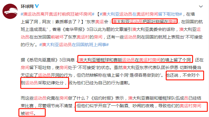 据《纽约时报》进一步披露,澳大利亚赛艇和橄榄球运动员在结束比赛后,他们似乎开启了一个酗酒、吵闹的夜晚,因此他们的奥运村房间被破坏。言下之意,澳大利亚运动员成了醉汉,开始肆无忌惮发酒疯,去破坏奥运村的设施。