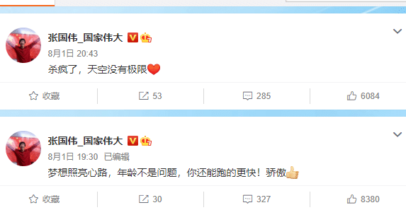 苏炳添半决赛创纪录,决赛获得第六名,他的好友、跳高名将张国伟也在社交媒体上发文感叹:“梦想照亮心路,年龄不是问题,你还能跑的更快!骄傲[good] ”、“杀疯了,天空没有极限”。