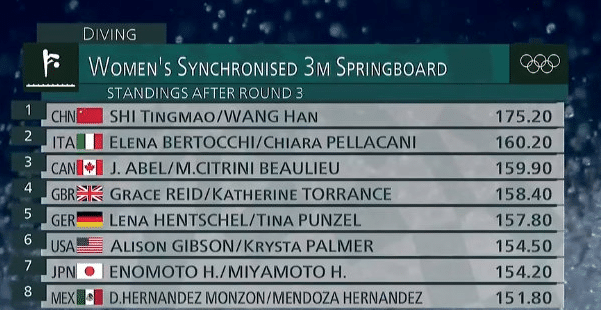 第一轮,施廷懋王涵,得到49.8分,位居第一名,意大利和美国选手并列第二;