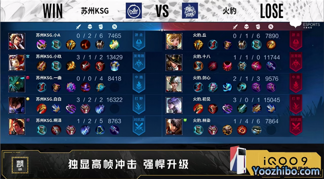 开局苏州KSG中路、发育路换线。1分10秒中路上河道团火豹打出1换2。3分钟野区团苏州KSG打出1换2。4分36秒苏州KSG摧毁敌方发育路外塔。5分48秒苏州KSG拿下先知主宰。6分15秒苏州KSG先后摧毁敌方中路、对抗路外塔。7分21秒苏州KSG摧毁敌方对抗路二塔。8分02秒苏州KSG拿下暴君。8分43秒苏州KSG摧毁敌方发育路二塔。10分20秒苏州KSG拿下暗影主宰。11分40秒高地团火豹打出0换2。11分32秒苏州KSG摧毁敌方发育路、中路高地塔。12分26秒火豹拿下暗影暴君。13分钟野区团,苏州KSG打出0换2。13分30秒高地团火豹打出1换2。15分23秒苏州KSG拿下1暗影主宰。16分28秒苏州KSG摧毁敌方对抗路高地塔。16分57秒苏州KSG拿下暗影暴君。18分钟高地团苏州KSG打出0换1,随后摧毁水晶拿下比赛。