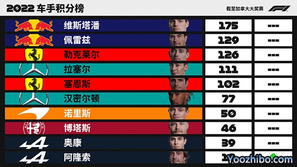 | 2022车手积分榜(截至荷兰大奖赛) | ||||