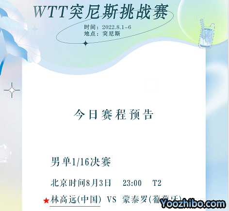 24直播网08月03日讯 ,WTT突尼斯挑战赛,林高远将会迎来亮相之战,男单1/16决赛对阵葡萄牙的蒙泰罗。这也是林高远在WTT冠军赛布达佩斯站男单决赛折戟之后的第一次比赛,国乒大部队已经回国,这次来到突尼斯之后,男单层面等于是林高远单独带队出战,也是他证明自己的好机会。