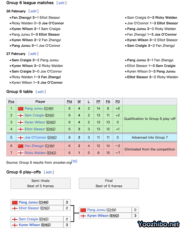 小组赛战罢,凯伦-威尔逊、克雷吉和庞俊旭均取得4胜2负的战绩,庞俊旭凭借净胜局优势获得小组第一。斯莱塞和奥康纳战绩均为3胜3负,前者凭借净胜局更多进入单败阶段,后者则获得了转战第七小组的资格。范争一和沃顿遭到淘汰。