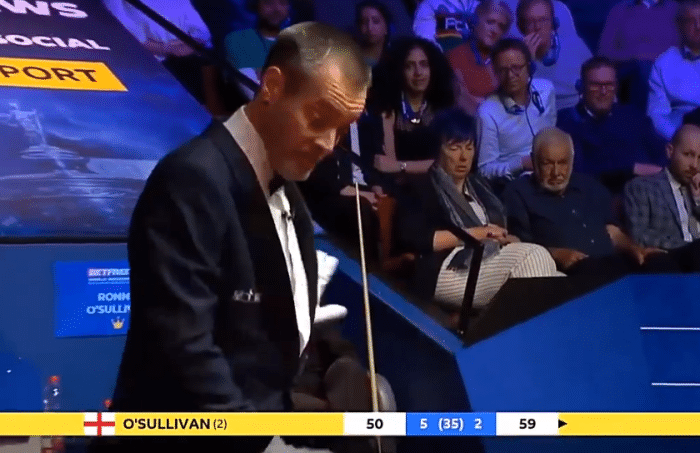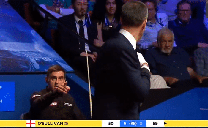比赛进行到第一阶段最后一局第8局,奥沙利文5-2领先。在最后阶段一次解球失误之后,奥沙利文回到座位。特鲁姆普准备击球,但此时裁判叫停比赛,来到奥沙利文的座位上和他进行交流。但显然,两人的交流并不愉快,奥沙利文伸出一根手指怒指裁判,结果被裁判警告。