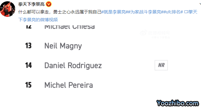 24直播网09月13日,UFC官方公布最新排名,在次中量级的前15名中,已经没有李景亮的名字。李景亮在此前与罗德里格兹鏖战3个回合,通过分歧判定,不敌对手,罗德里格兹则空降榜单第14。如今李景亮看到世界排名之后表示:“什么都可以拿走,勇士之心永远属于我自己。”