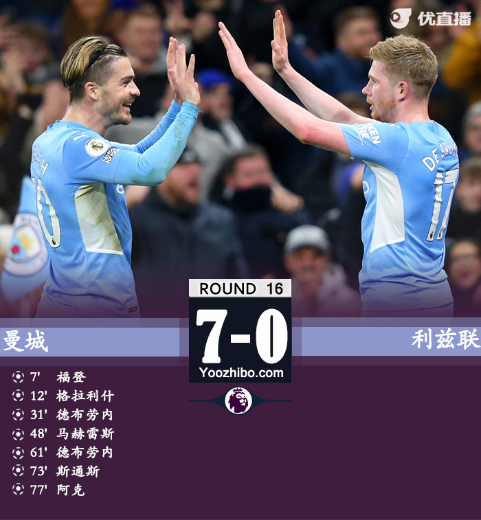 24直播网12月15日讯 北京时间12月15日4:00,英超第17轮继续进行,曼城主场迎战利兹联。上半场,福登率先进球,马赫雷斯助攻格拉利什头球扩大比分,罗德里助攻德布劳内再入一球,曼城3-0暂时领先利兹联。下半场,马赫雷斯低射破门,德布劳内世界波完成双响,斯通斯和阿克均取得个人联赛首球。最终,曼城7-0大胜利兹联,七连胜继续领跑积分榜。