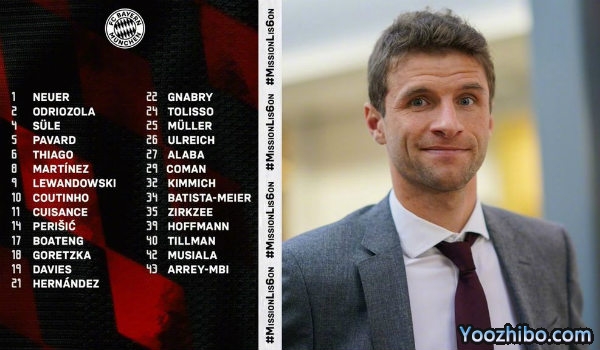 前锋:9-莱万多夫斯基、14-佩里西奇、22-格纳布里、25-穆勒、29-科曼、34-迈尔、35-齐尔克泽