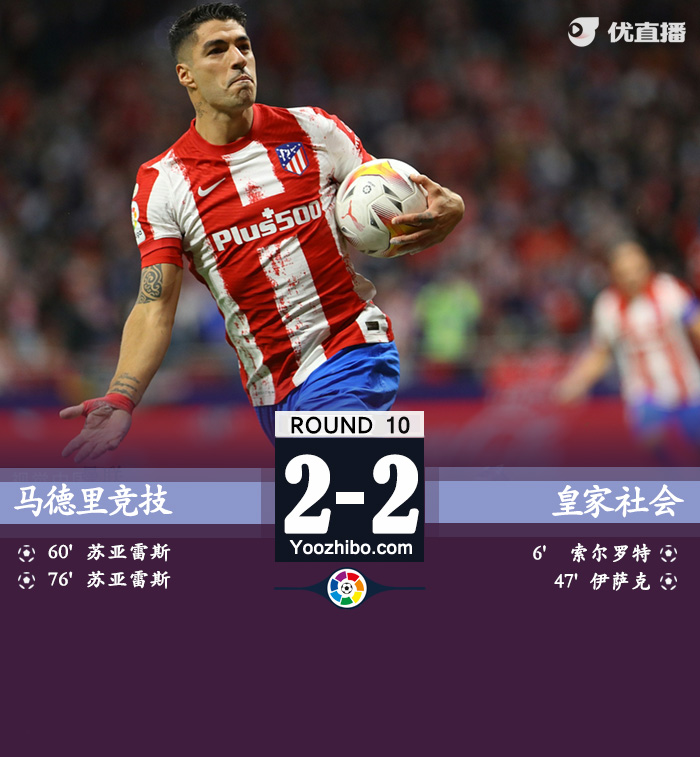 24直播网10月25日讯 北京时间10月25日03:00,西甲第10轮,马德里竞技对阵皇家社会。上半场比赛,索尔罗特破门,格子失良机。半场战罢马竞0-1皇家社会。下半场比赛,伊萨克任意球破门,苏牙头球扳回一城,随后点射追平。全场比赛战罢,马竞2-2皇家社会。