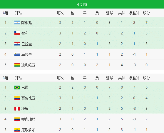 24直播网讯 北京时间6月22日,美洲杯小组赛第三轮落下帷幕,本轮东道主巴西队延续出色发挥,阿根廷队也迎来连胜,提前晋级到淘汰赛。秘鲁击败哥伦比亚,厄瓜多尔和委内瑞拉战成平手。美洲杯的赛制是10支球队分为两个小组,前四名晋级到八强参加1/4决赛,然后就是单场淘汰赛决出冠军。接下来我们一起来看看美洲杯最新排名: