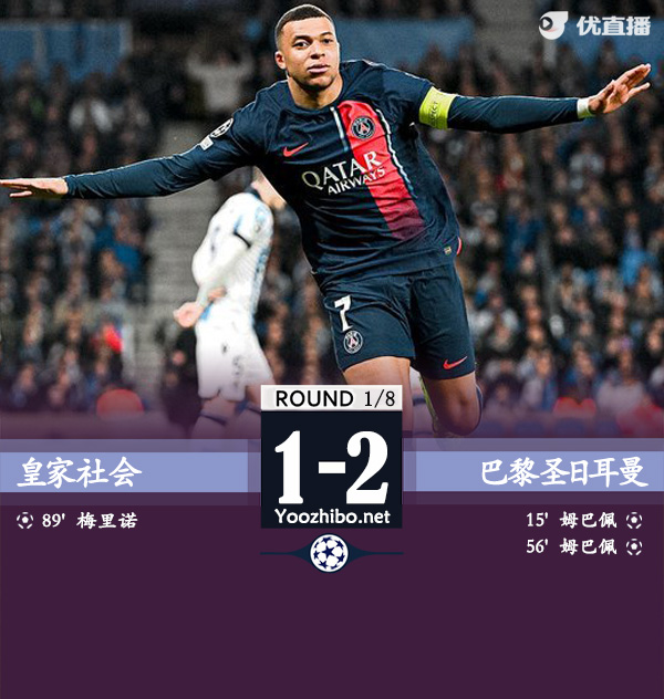 24直播网讯 北京时间3月6日欧冠 1/8决赛次回合,皇家社会主场对阵巴黎圣日耳曼。上半场,巴尔科拉门前包抄打门被挡,登贝莱手术刀般直塞助攻姆巴佩精彩破门,姆巴佩迎球劲射被极限解围,久保建英低射被挡后再次远射稍偏;下半场,李刚仁助攻姆巴佩单刀破门上演梅开二度,巴雷内切亚头球入网被判越位进球无效,阿什拉夫边路突破打门被封堵,图连特斯近距离凌空打门被扑,梅里诺凌空爆射得手挽回一丝颜面。最终比分1-2。