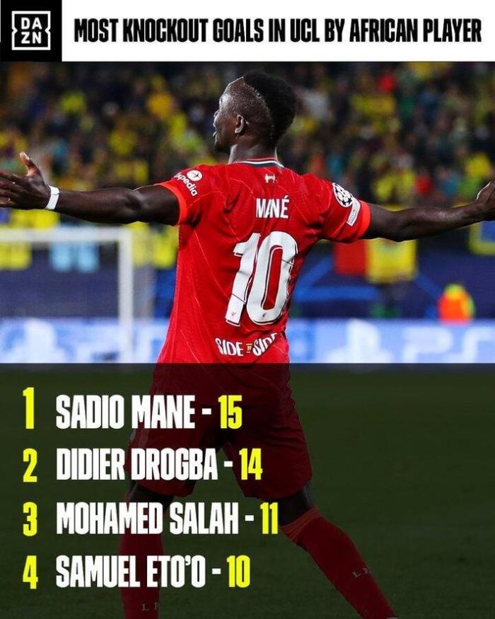 根据数据统计,马内职业生涯至今已在欧冠淘汰赛打入15球,超越德罗巴,成为历史上欧冠淘汰赛进球最多的非洲球员。
