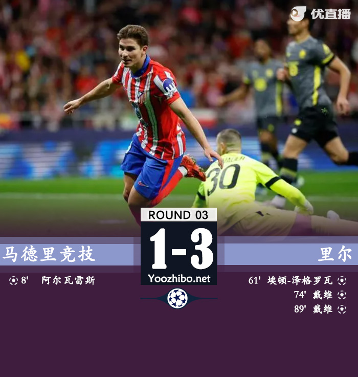 24直播网讯 北京时间10月24日欧洲冠军联赛的较量中,马德里竞技迎战里尔。上半场,里尔后卫奥斯曼-图雷送大礼,阿尔瓦雷斯推射破门。下半场,热格罗瓦兜射入死角帮助客队扳平比分。随后,主裁判判给里尔一粒点球,乔纳森-戴维主罚命中。终场前,乔纳森-戴维再下一城。全场比赛结束,马竞主场1-3遭里尔逆转。