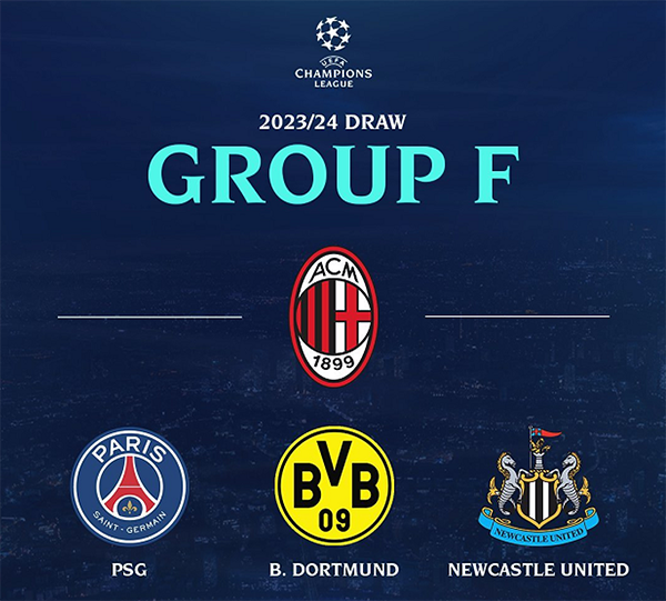 24直播网09月01日2023-2024赛季欧冠小组赛抽签落下帷幕,F组成为名副其实的超级死亡之组,法甲冠军大巴黎、德甲亚军多特蒙德、意甲豪门AC米兰、足坛新贵纽卡斯尔被分在同一个小组,成为本次欧冠抽签关注度最高的小组。