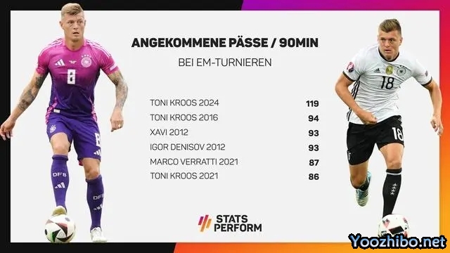 24直播网讯 根据统计,现年34岁的托尼-克罗斯本届欧洲杯小组赛前两轮平均每90分钟能够为队友送出119脚传球,在欧洲杯历史上所有出场至少150分钟的中场球员里,这样的数据排名第一。