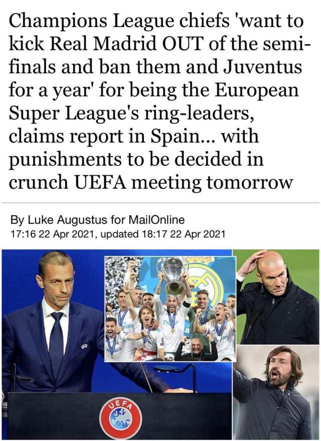 据悉,欧足联正在考虑这些豪门的请求,并且最快在当地时间周五就作出决定。而欧足联主席切费林此前在接受采访时,也暗示了自己确实在考虑对“揭竿起义”的欧超领导者的球队进行处罚。他甚至直言不讳的表示:皇马本赛季还会继续参加欧冠,但以后就不一定了。