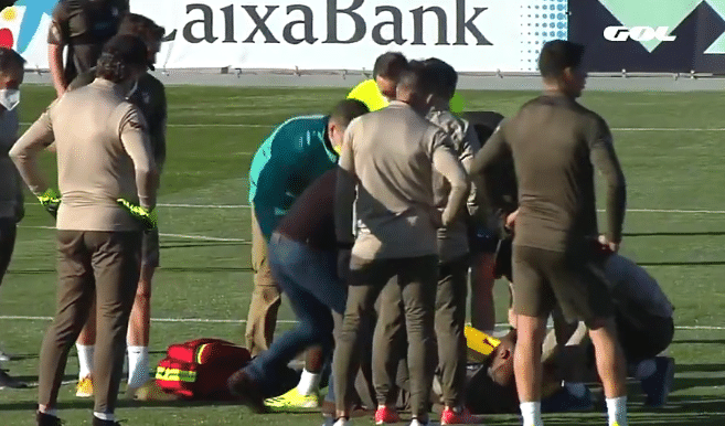 在训练场马竞球员正在训练备战下一场的比赛,对于下一战他们志在必得,但是在训练赛上出现了十分揪心的一幕,穆萨-登贝莱在没有任何征兆的情况下,他突然昏厥倒地,而且身体还出现了抽搐的情况,场上的球员也是来到他身边查看他的情况,队医则是第一时间过来将他的身子侧了过来,而他的很多队友跟随着医护人员来到救护车上取担架,在经过医护人员的现场急救后,穆萨-登贝莱醒了过来,在医护人员的搀扶下他慢慢的站了起来。